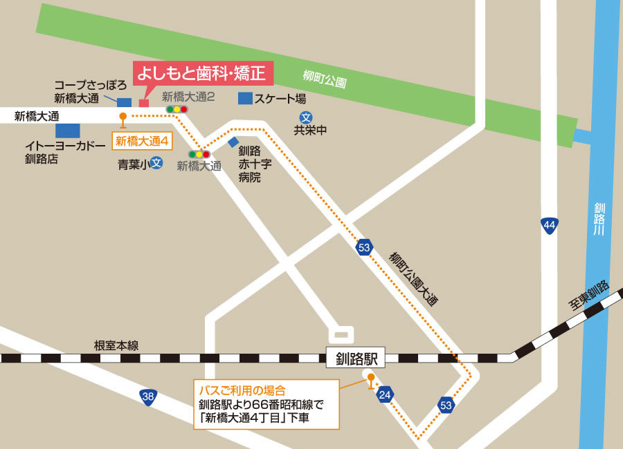 釧路駅7番のりばより昭和線(66番)で「新橋大通4丁目」下車